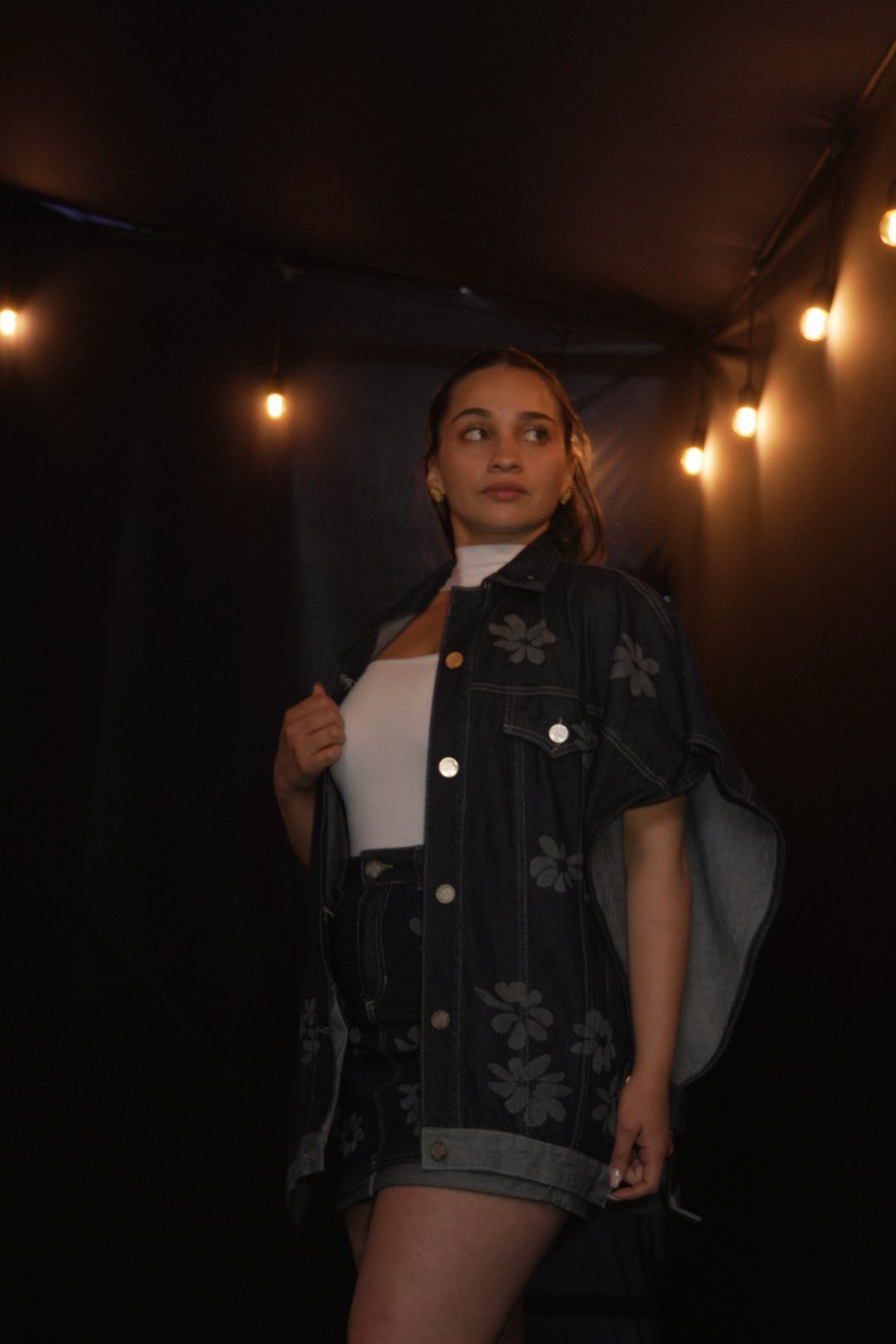 Capa en denim con detalle de flores, diseñada para darle un giro moderno y femenino a cualquier outfit.
