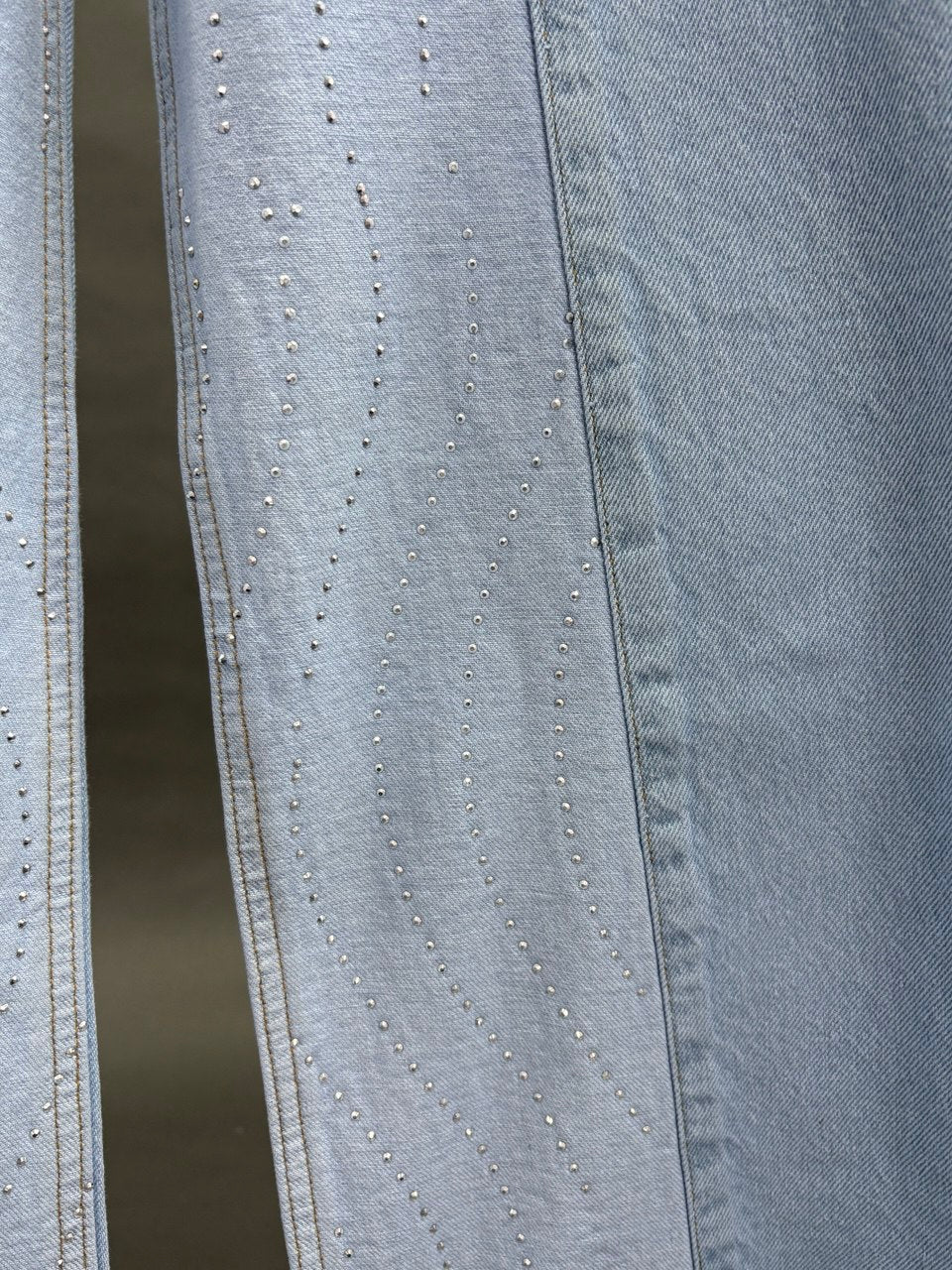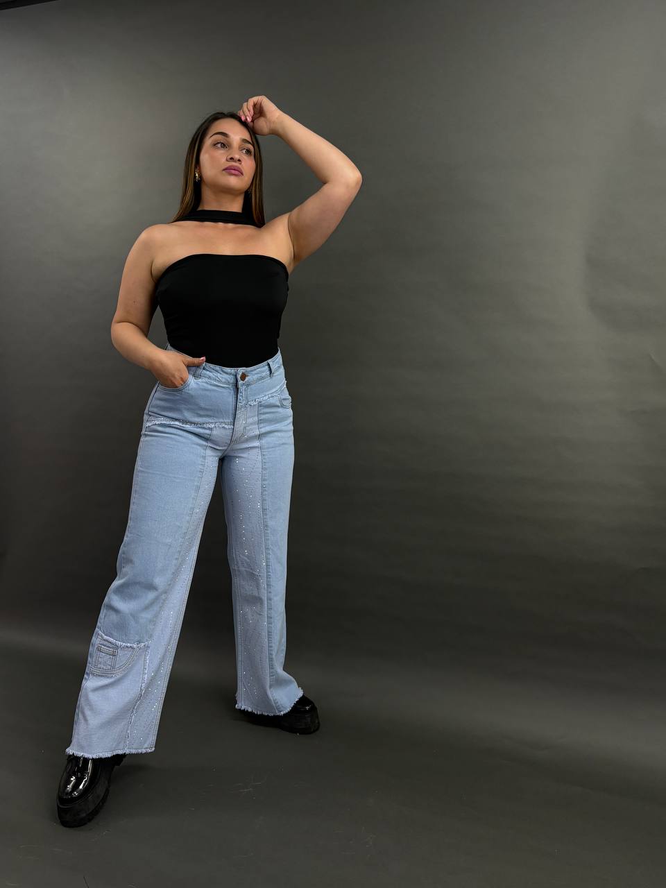 Su silueta palazzo de tiro alto estiliza y alarga la figura, mientras el denim rígido mantiene la estructura y resalta la horma. La pedrería ondulada atrapa la luz en cada movimiento y los cortes desflecados le dan ese detalle diferente que cambia todo el look.